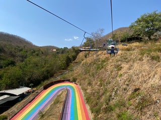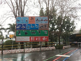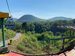 ถ้ามาช่วงบ่ายแดดร้อนจัด เครื่องเล่นราคา 150 บาทหมดทุกอย่าง แต่ต้องเสียค่ารถรางเข้าไปคนละ 50 บาท